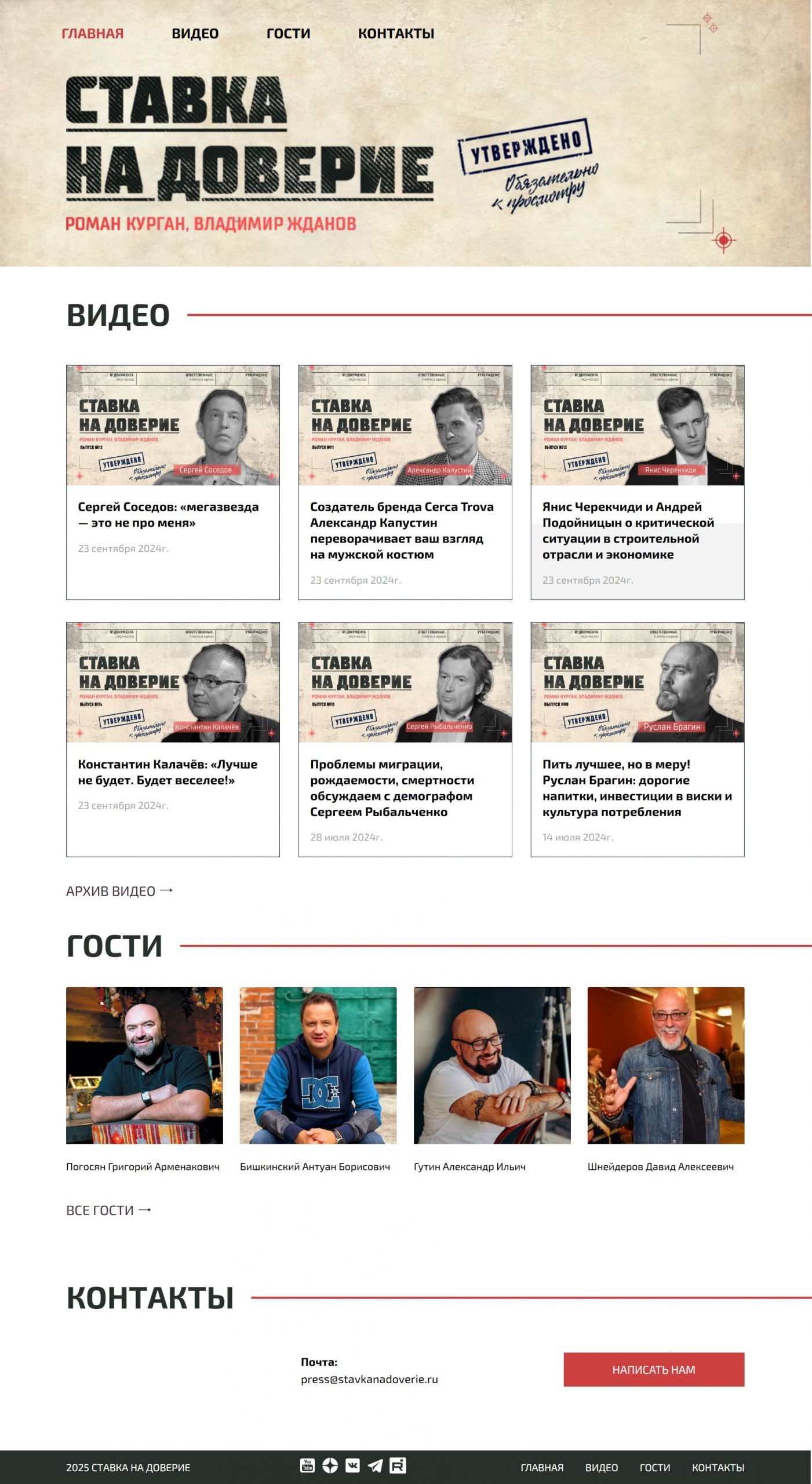- Раздел «Гости» с карточками приглашённых, их именами и ссылками на интервью.